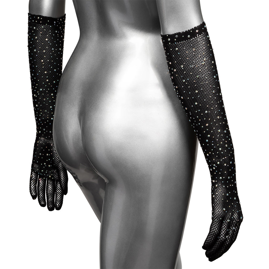 Soft and stretchy, these sparkly beauties reach up to or past your elbows and feature a mix of classic black net and glittery rhinestones.