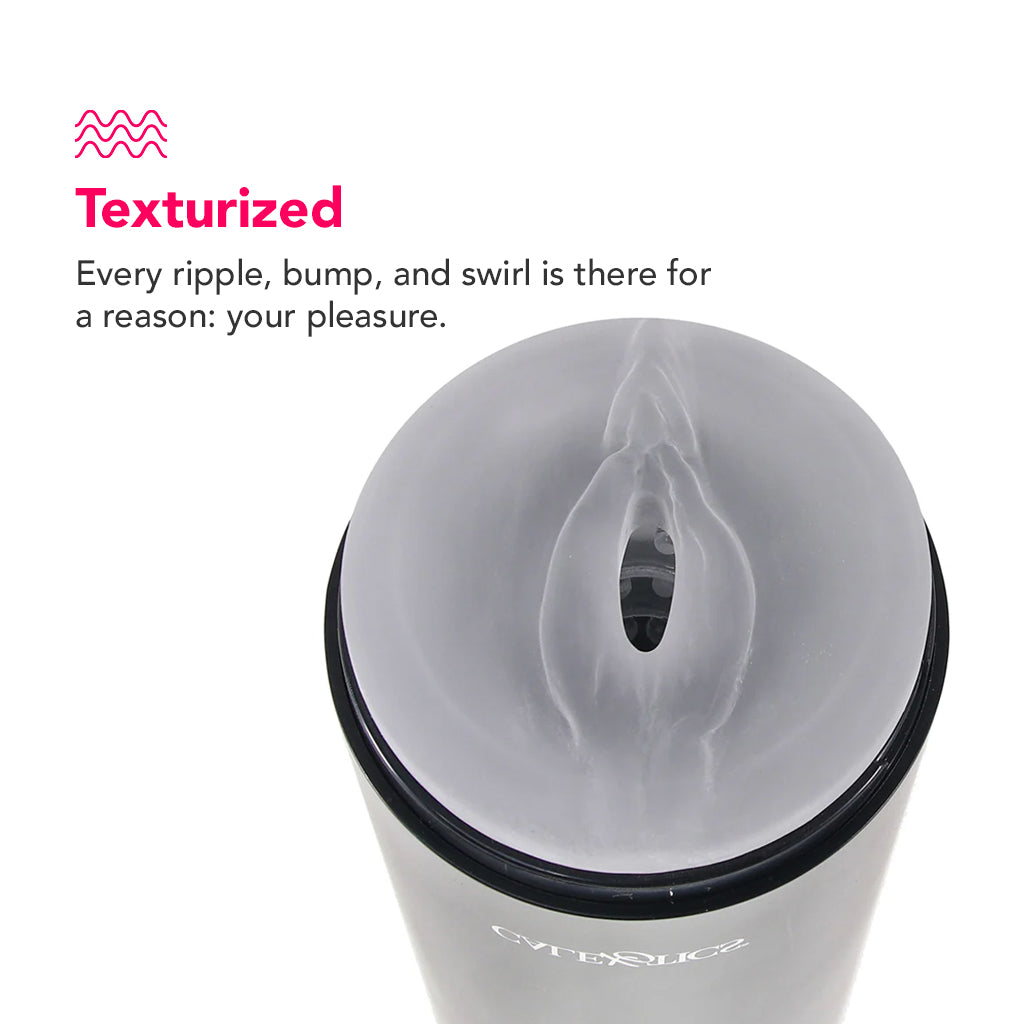 Let's start at the beginning - or the entrance if you'd rather. Pop the cap on the slick, easy-grip black case to reveal a snug detailed pussy opening. When you're ready to dive deep, it'll envelop you or a partner's shaft in plushy, stretchy softness and tons of stimulating pleasure chambers. The