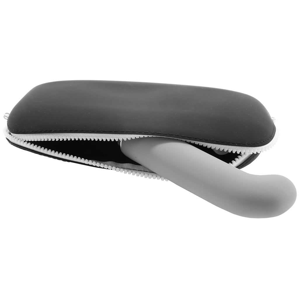 After washing with a good toy care fluid/foam or some good ol' warm soapy water, simply pop your vibe/dildo/plug/clamps into the bag, zip up, and store as usual. The Happy Rabbit Storage Case measures about 10" (25.4cm) wide and 5.5" (13.9cm) tall.