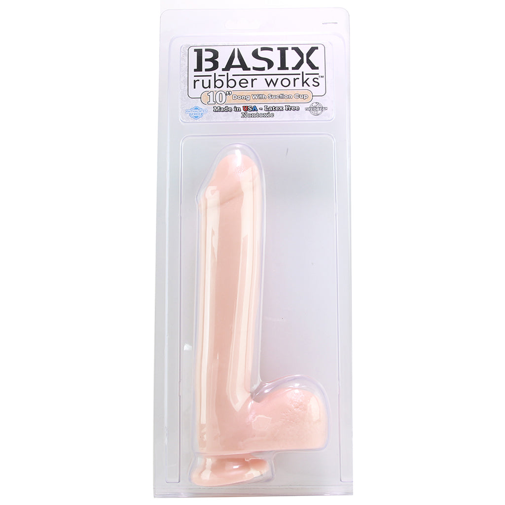 The extra large design and sturdy suction cup base on the Basix 10 Inch dildo will satisfy the both the fans of deep, girthy penetration and anyone who like to play hands free. Styled realistically, with a gently tapered head and wide balls, there's lots of room in between; the soft, squeezable balls double as a handle, while also making the Basix 10 Inch safe for anal insertion. As mentioned, there's a nice strong element of suction to this toy, the base forms into a suction cup that attaches easily and sturdily to almost any smooth, flat surface (think shower walls, floor etc.), and tapers enough to be used with a harness, too. The plush rubber that makes up this toy box staple is soft and flexible, while still remaining firm enough to satisfy and fill you up just right. It's also latex and phthalate free for lots of safe use. To keep your dildo at its best, use a good water based lube, and as with any toy, wash well before and after use. Made in the US.