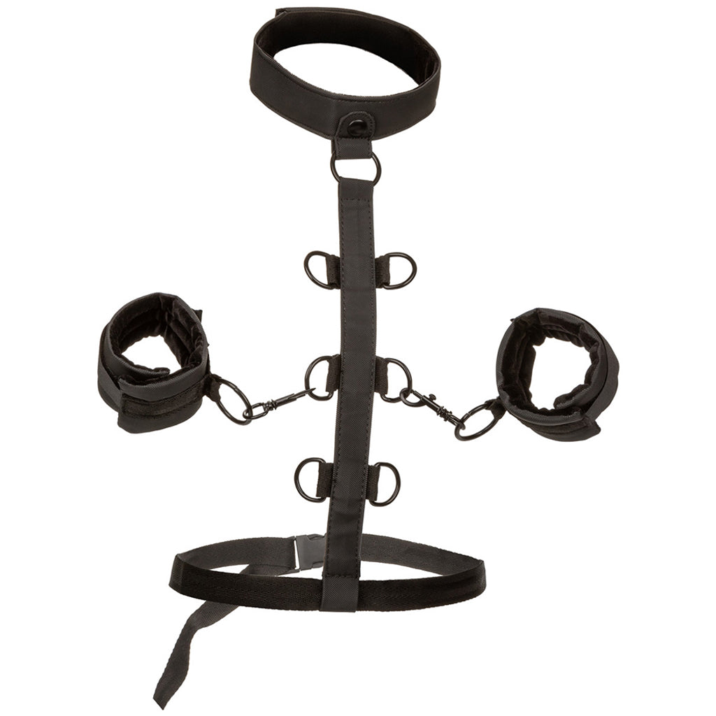 It's great looking, extra versatile, and can be quickly customized to suit the scenario at hand - it's the Boundless Collar Body Restraint, and it's ready to play as hard as you can. Seriously.Able to be worn on the front of your/their body or behind, the Restraint fits over the neck and tightens over the waist for maximum security. A pair of universal swivel cuffs are included, all set to be clipped to six possible D-ring connectors along the vertical body strap. The best part? Not only does the Restraint do a bang-up job (hehe) as a one piece, the cuffs can be fully disassembled and used any way you see fit.