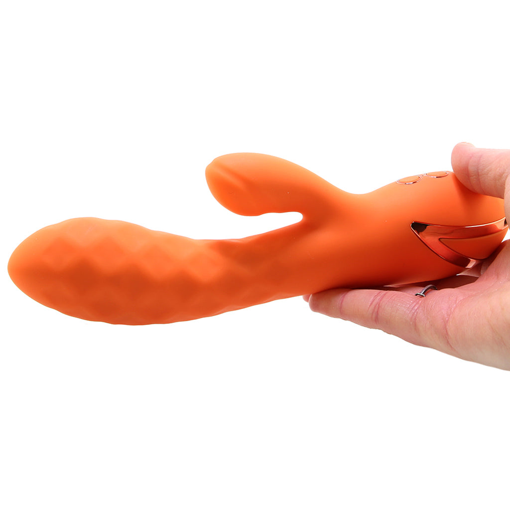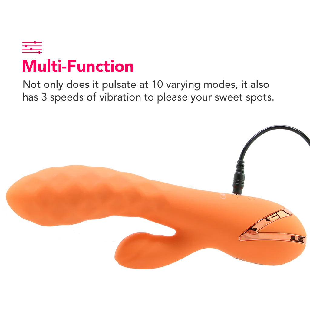 Super swollen at a textured tip and featuring a totally unique thumping mechanism in its external stimulator, the Beach Babe is a perfect alone-time stimulator, or a partner-perfect play tool. Embedded in the up-curled clitoris (and beyond) stimulator, 10 modes of thumping pulsation captivate any lucky sweet spot that happens to have come in contact - 3 speeds of classic vibration throb throughout the entire vibe, as well. Enjoy vibration and thumping together or separately, a simple 3 button interface controls all.