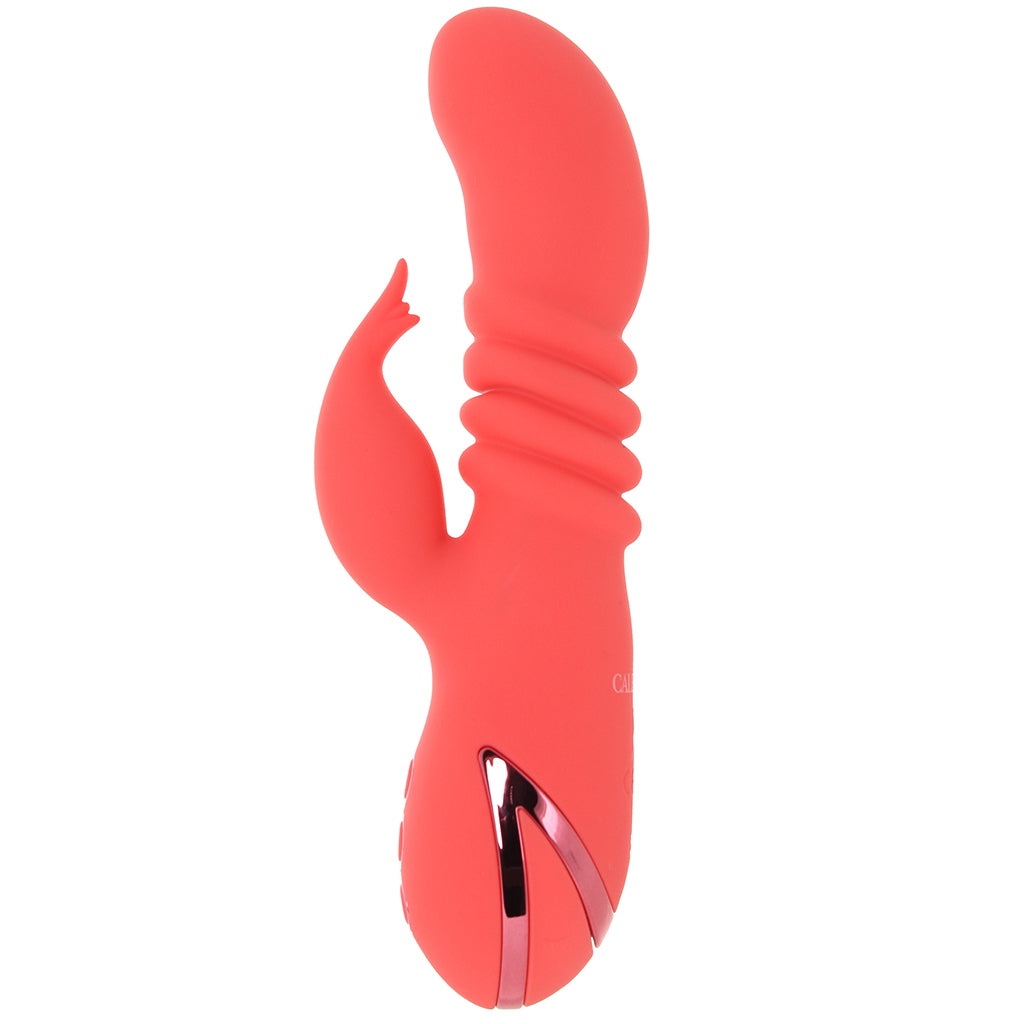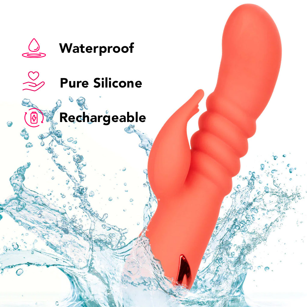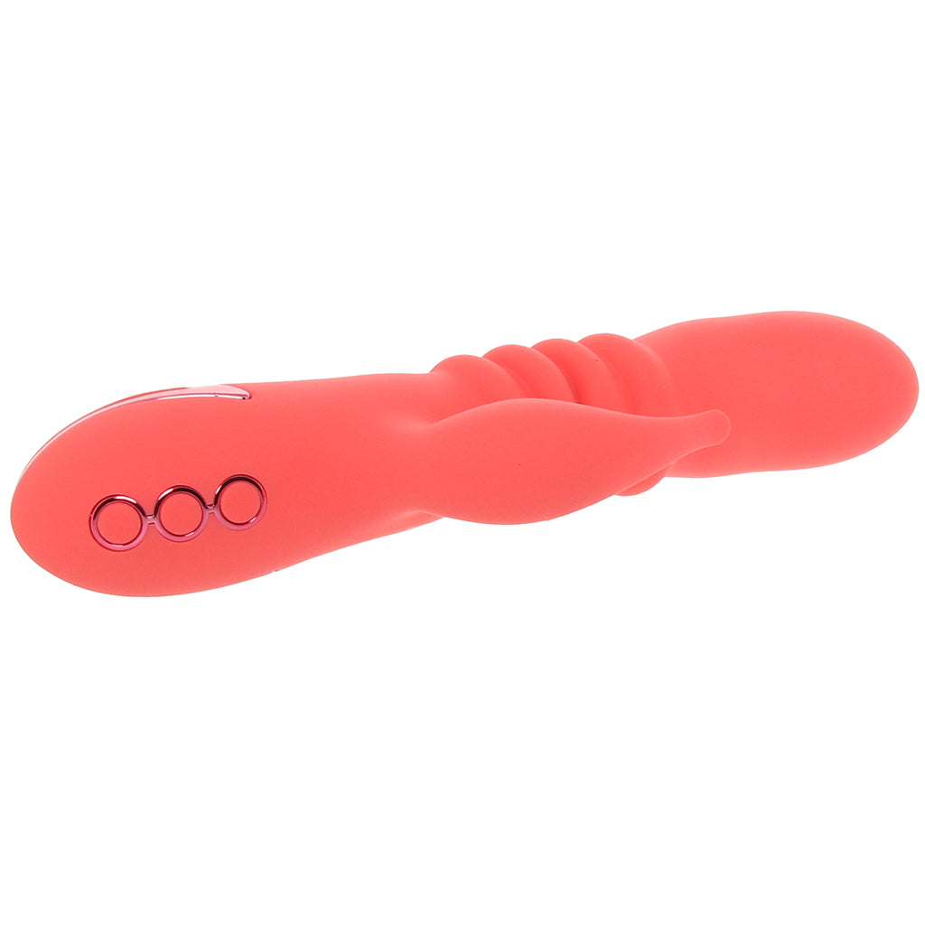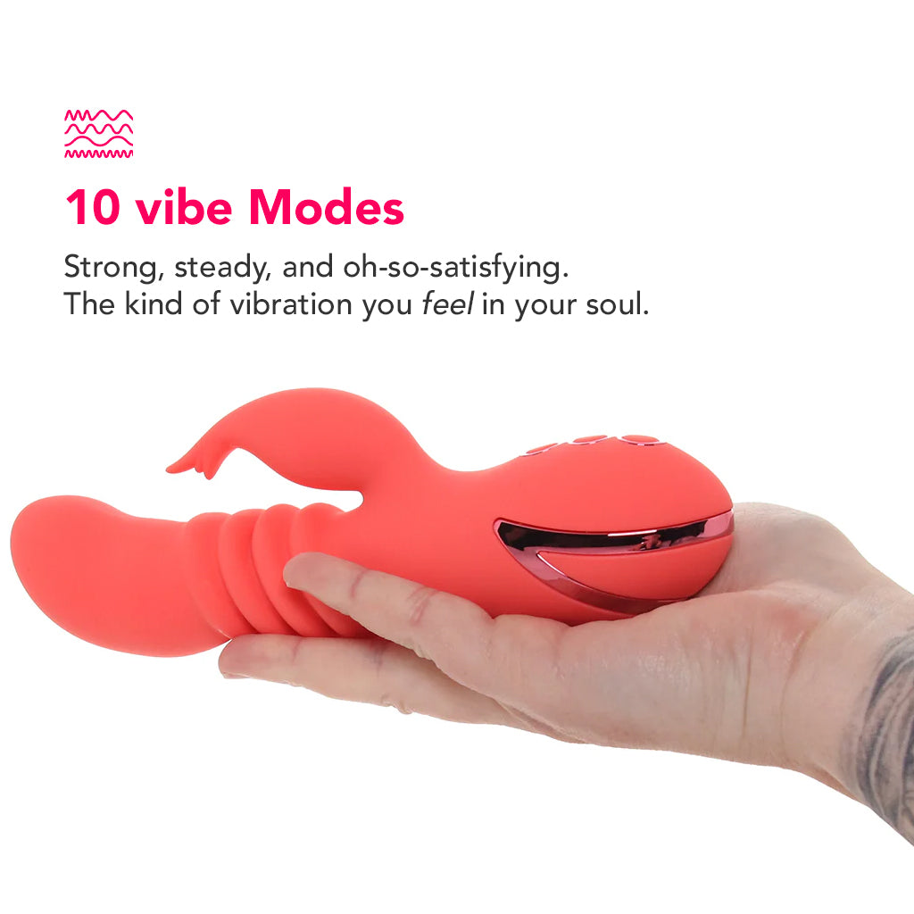 This thrusting rabbit vibe is built to whisk you away to your happy place. The curvy, forward-tipped penetrator dives straight toward your hot spots while the soft external teaser flutters below. With three speeds of thrusting plus ten vibration modes (yep, they run separately), you get to mix, match, and ride the wave however you like.