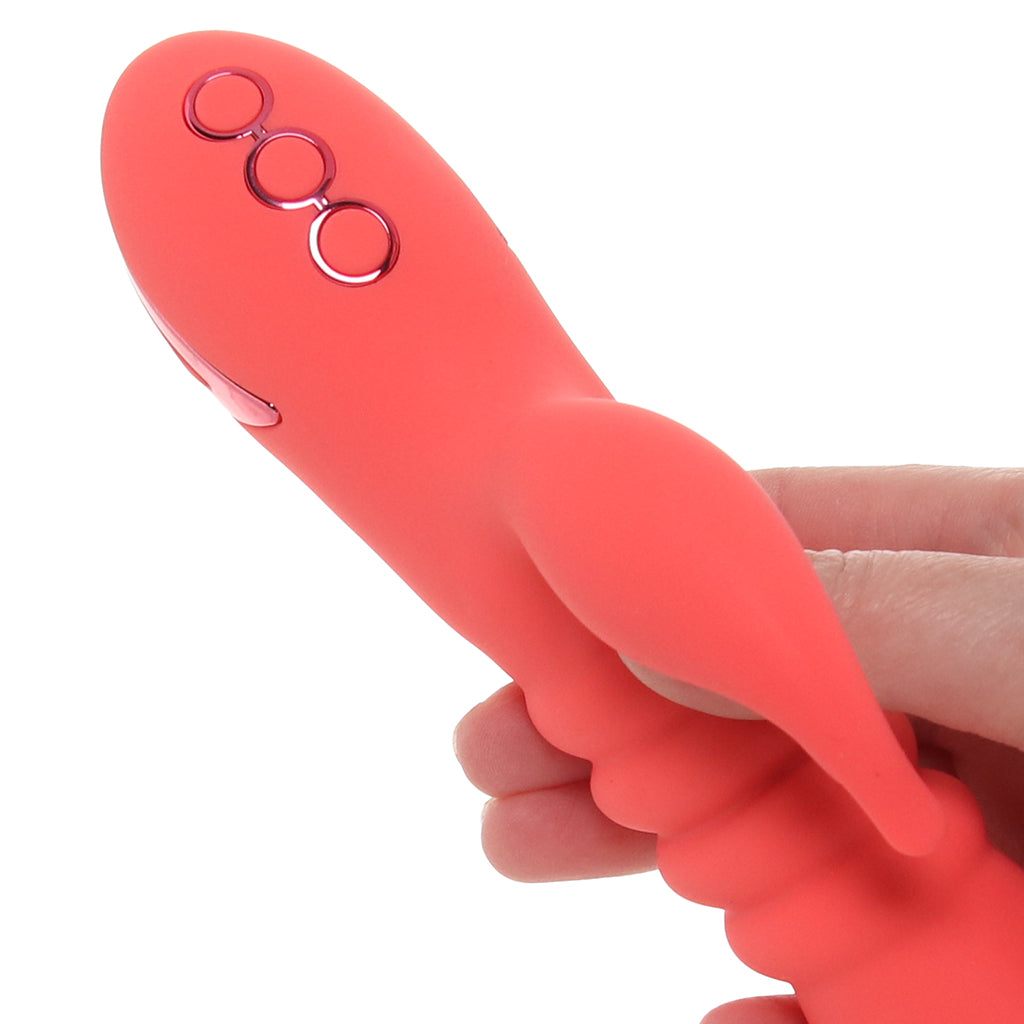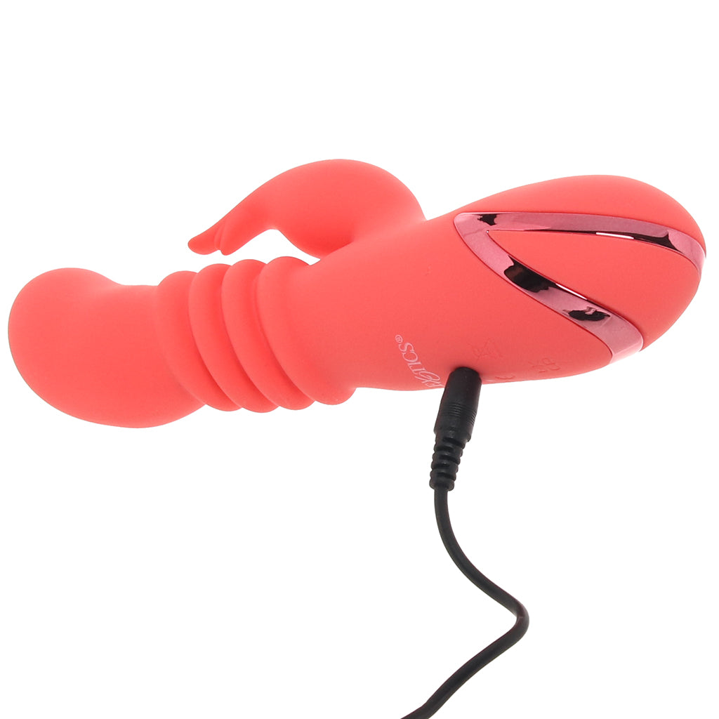 This thrusting rabbit vibe is built to whisk you away to your happy place. The curvy, forward-tipped penetrator dives straight toward your hot spots while the soft external teaser flutters below. With three speeds of thrusting plus ten vibration modes (yep, they run separately), you get to mix, match, and ride the wave however you like.