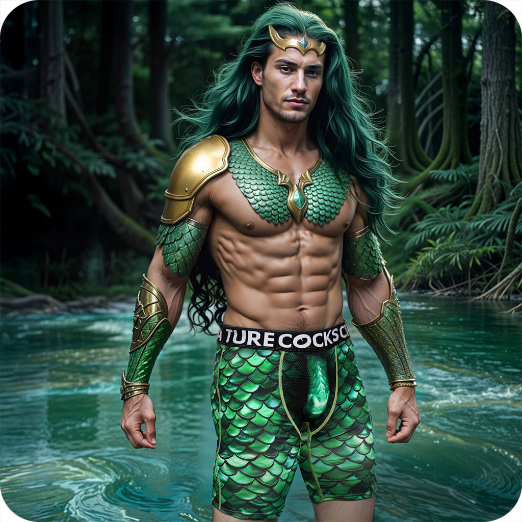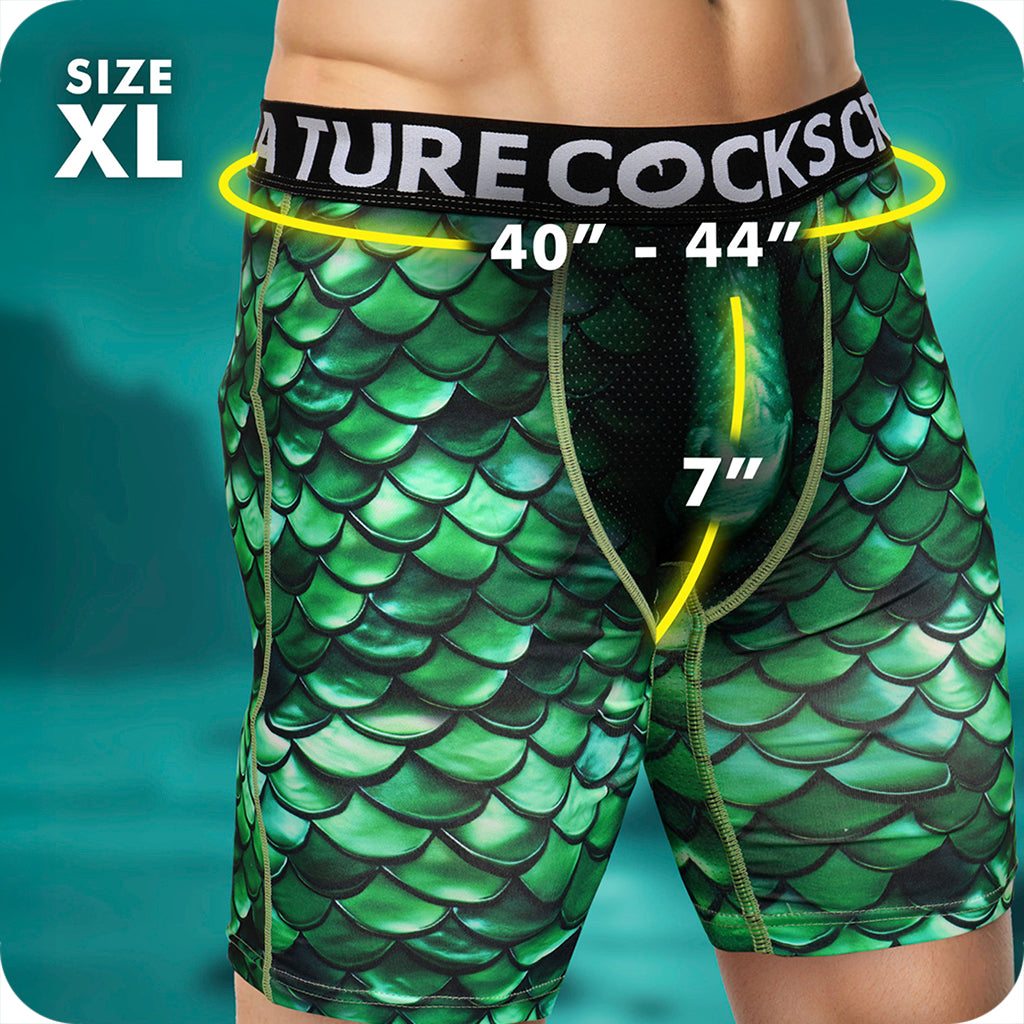 These shorts are absolutely not here to blend in. Covered in vivid green scales with a full-on monster moment front and center, they bring fantasy-creature chaos along everywhere they go. The dragon-style design draws eyes, while the sculpted front gives your bulge a little extra “oh hello!”