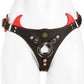 Featuring a sexy horned shape, an open back, and three snap-in metal O-ring penetrator connectors (1.25"/3.2cm, 1.5"/3.8cm, 2"/5.08cm), the vegan leather Horny Devil is a perfect match for all your faves. Slide in a beloved Creature Cock, or pair it up with (almost) any flared-base dildo you love.