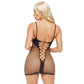 Up top, this classic halter style piece dives low to bare lots of cleavage and upper back skin. The extra wide-weave net down the center leaves very little to the imagination; same with the skimpy little skirt. Pair it with some other lingerie favorites, or rock it solo.