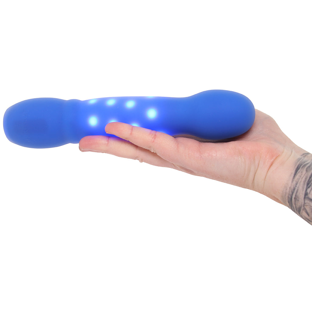This glowing party-starter brings the vibes and the visuals. The sturdy, soft silicone shaft lights up with swirling green and blue patterns that shift with each of the ten vibrating speeds, turning your play session into a full-on private light show.