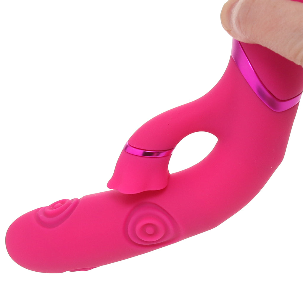 Once in a blue moon (or once in a bright pink vibe!), you really can have it all. Case in point: Shots' Vive Fiore Air Wave Tapping Rabbit. This anything-but-ordinary double stimulator features, among other things, a ferociously full-coverage shape, six thumping pulse points, sexily subtle suction, AND a very special Climax mode.