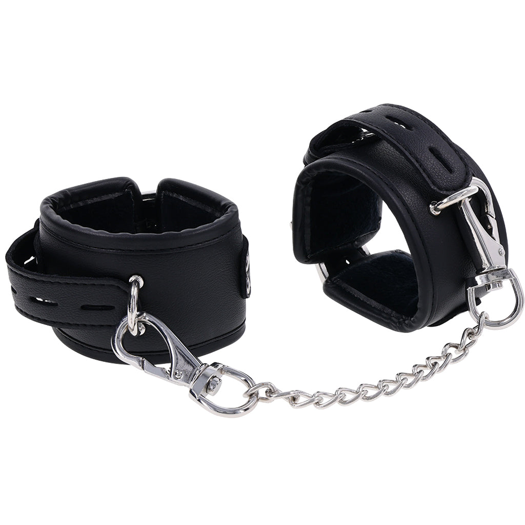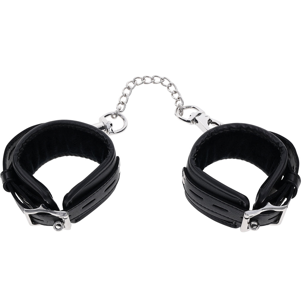 A perfect pair for the sub in your life/bedroom, Sportsheets' Edge Cuffs combine comfortable, gorgeous faux leather styling with (very!) sturdy silvery hardware, soft inner padding and a 10.25"/26cm connector chain. Pair 'em with a favorite paddle, ball gag or blindfold for max effect.