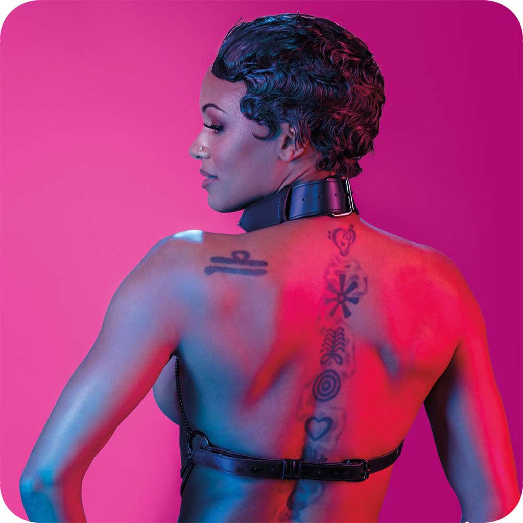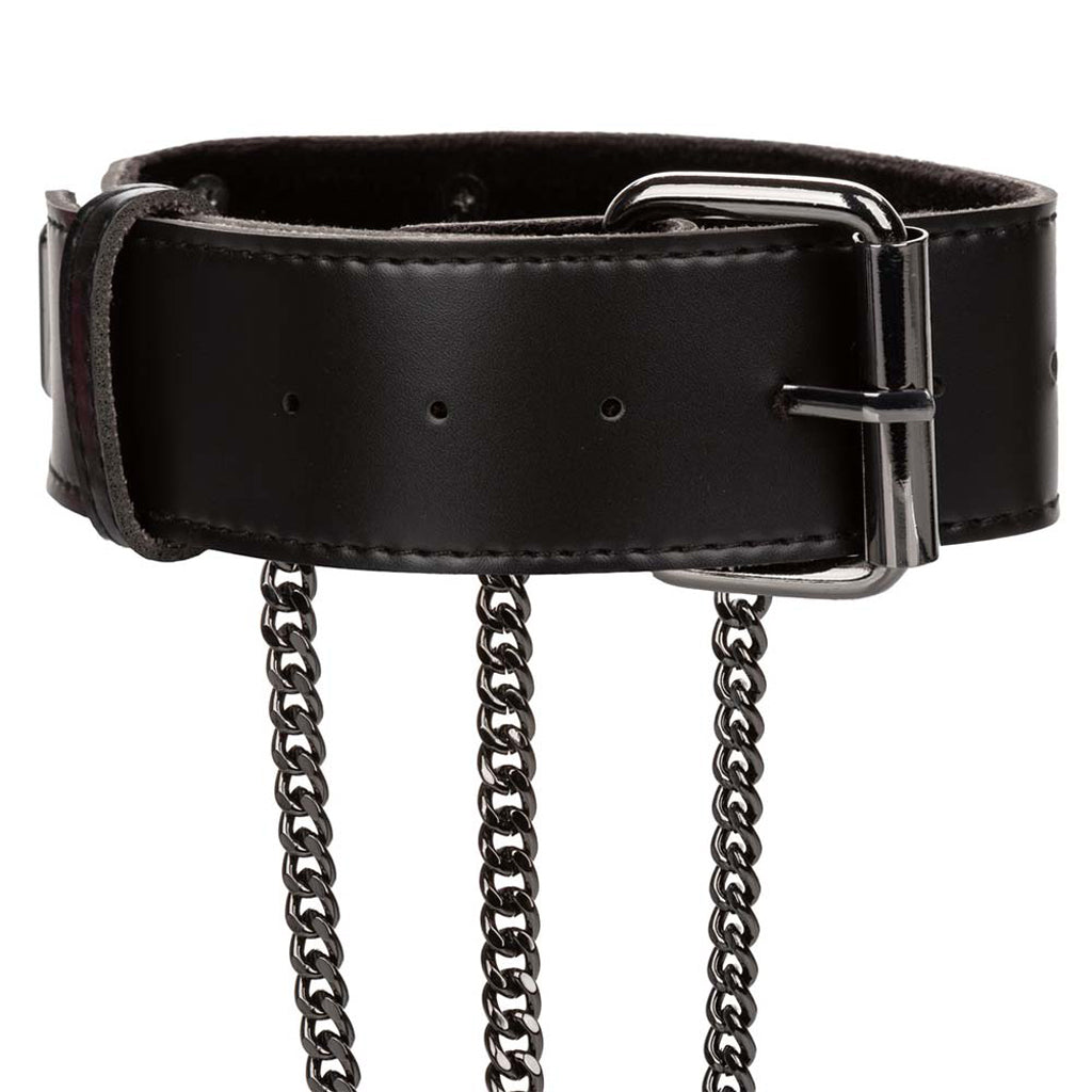 This dreamy velvet-lined harness buckles choker-style around your neck and the top of your back. Rows of flexible chain frame your curves and meet in the middle at a sturdy O-ring. That ring and several others can be clipped or clamped to cuffs, leashes, tethers, and more - if you're so inclined!