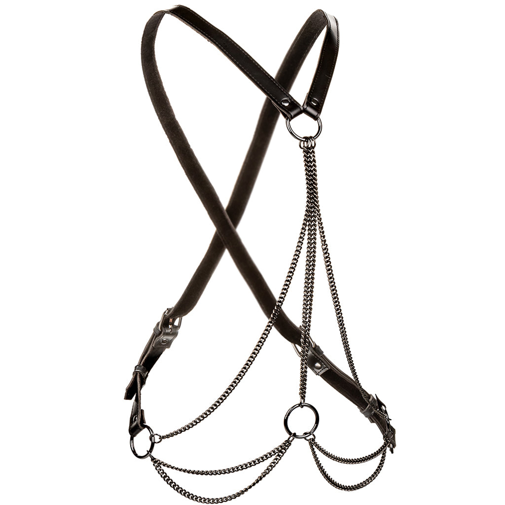 The comfortable, velvet-lined body harness fits over your neck and buckles in a cross around the back. Meanwhile, a triple strand of vertical chains and two swopping horizontal ones accent your best assets. If you're so inclined, you can clip or clamp four strategically placed O-rings to cuffs, leashes, tethers, and more.