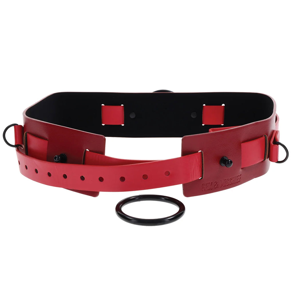 Slip the Belted around your waist, position the included metal O-ring through the connector straps, and snap it into place. Easy! Once it's on, you can clip any universal cuff/restraint to several mini D-ring options or the center O-ring.