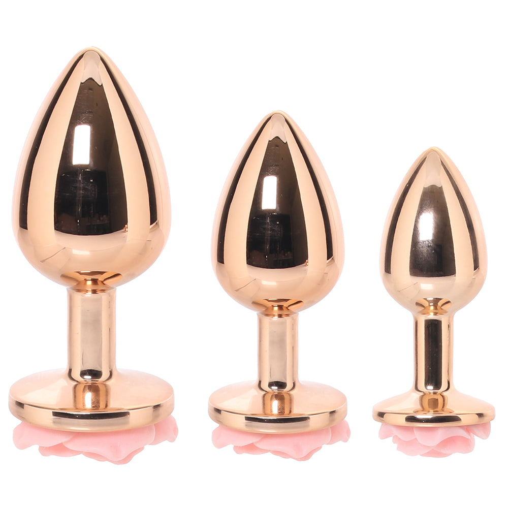 Inside you'll find three butt play must-haves in smooth rose gold aluminum, each with a gorgeous rose embedded in the base. Pick the smaller plug if you're an anal penetration newcomer/you're working up to something bigger, dive right in with the large if you're feeling confident, or split the difference with the medium.