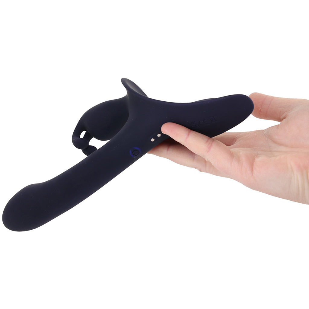 On one side of your Giving, you'll find a classic bunny vibe in super-silky silicone. On the other, a curvy base has a bumpy clit/outer sweet-spot-targeting swell. Whoever's wearing the harness will feel it throb while their partner gets filled up by the bunny. Win/win!