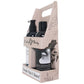 Side-by-side in a sturdy, prettily-patterned cardboard caddy sits two full-sized moisture staples: pure, natural Waterslide water-based lube and some sweet, lick-able Edible Massage Oil.