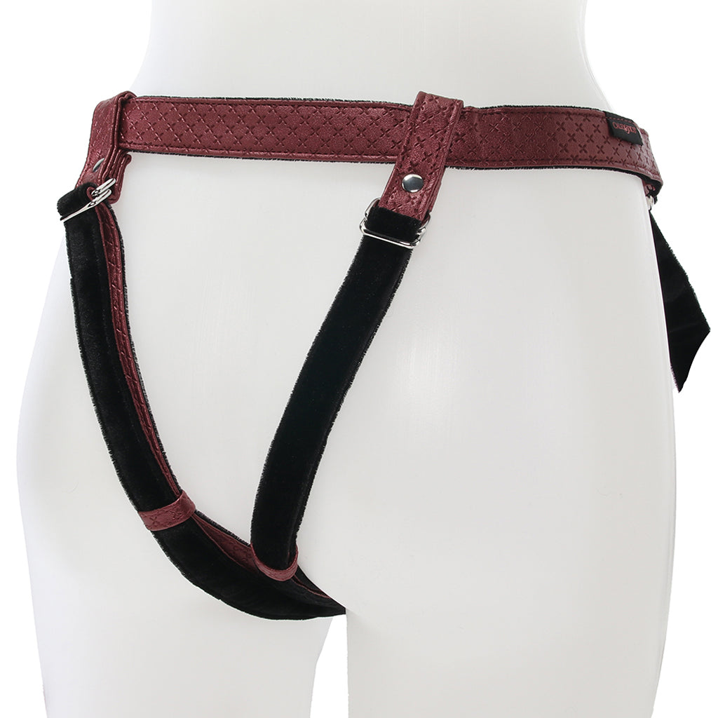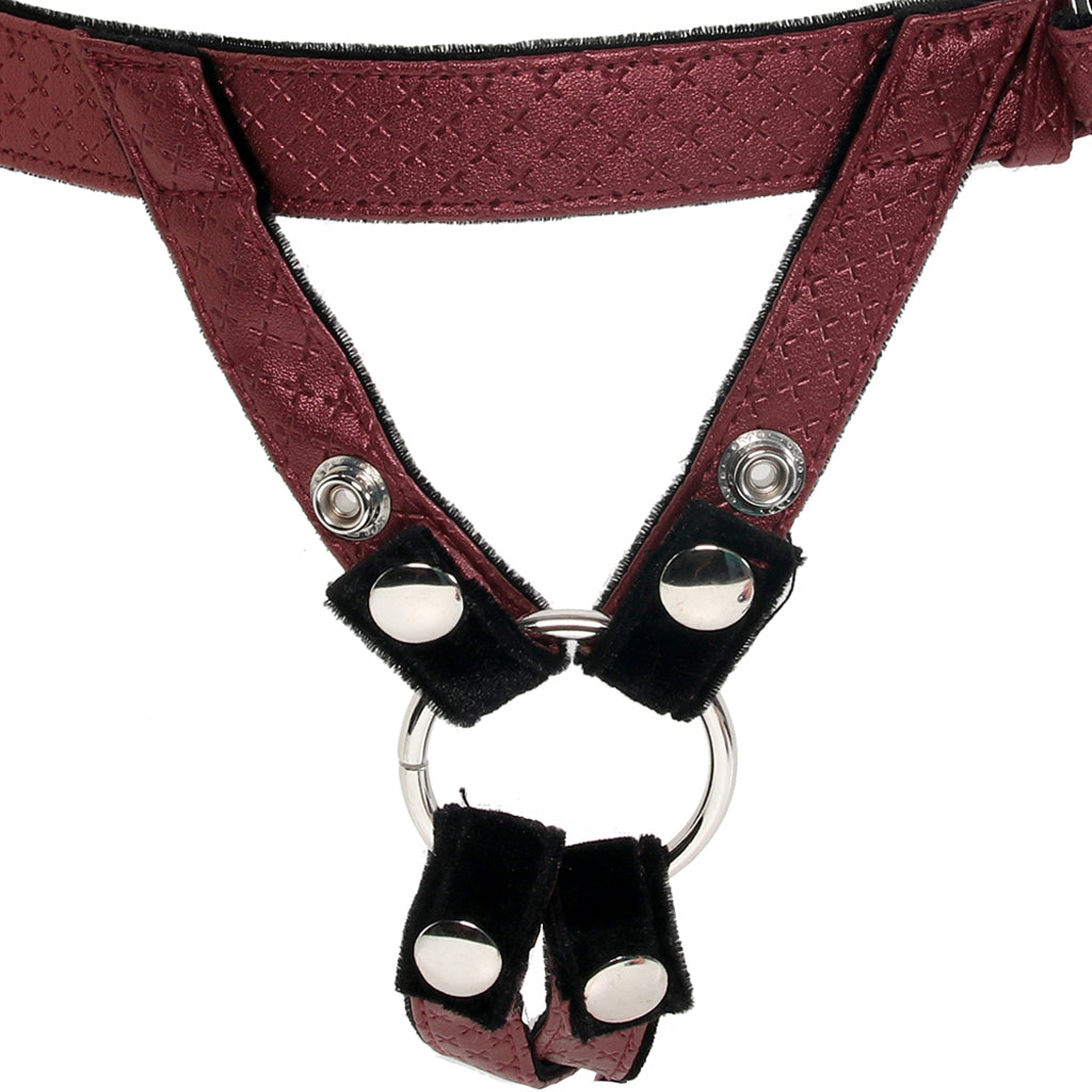 Holding comfortably around the waist, a soft lined band adjusts to a perfect fit as two thin straps reach around to loop under each butt cheek. Simply tug the strap ends to adjust sizing. Around front, set perfectly mid-yoke, one of three sturdy metal O-rings secures a dildo or vibe of choice into place - the ring snaps on and off for quick toy attachment and any possible penetrator switch-ups.