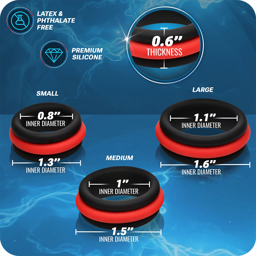 This Set gives you three different sizes to play with, plus removable center rings that let you change the fit and pressure as you go. The wider black band adds a broader, cushioned squeeze, while the red inner ring bumps up the pressure when you want a tighter grip.