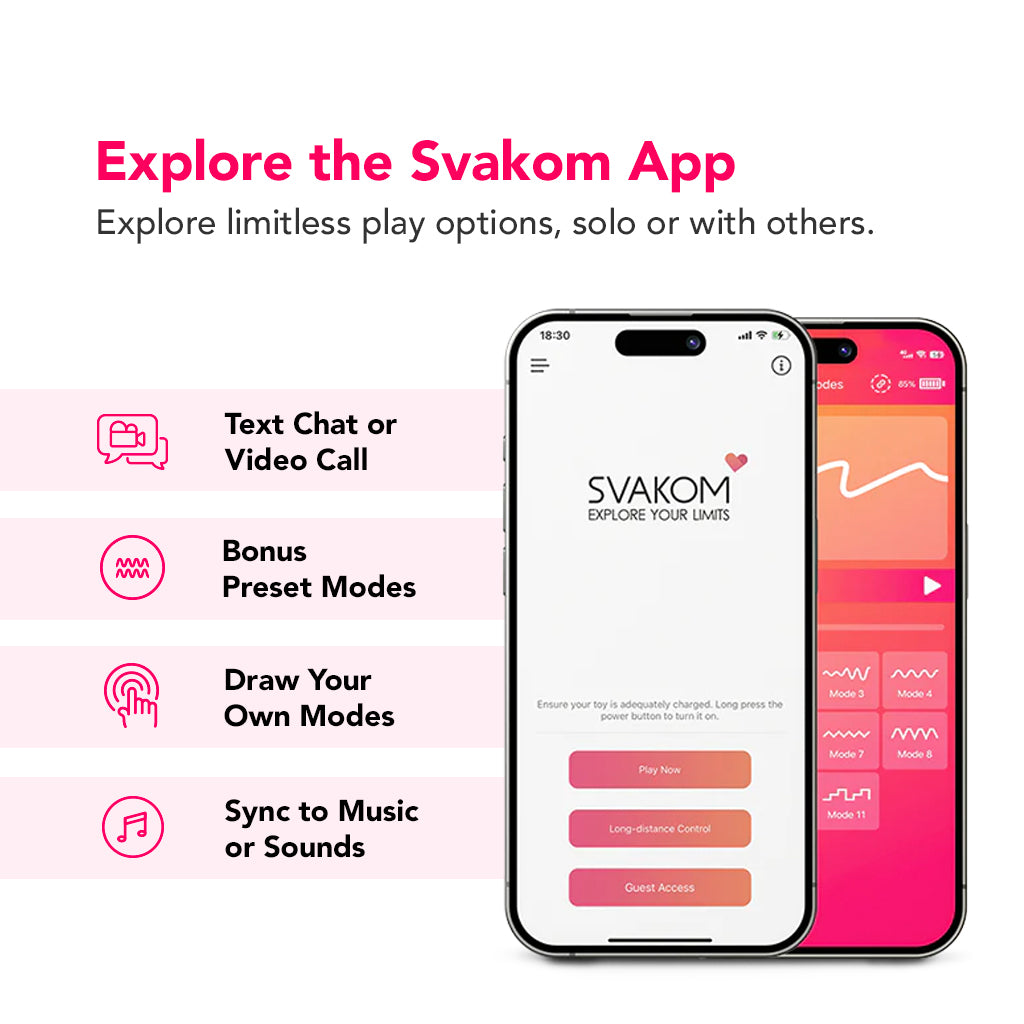Want even more control? Download the Svakom App. Once installed, you or your partner can access unique sound, voice, touch, and music-activated vibration patterns, webcam options, and more. You'll even be able to control your partner's Jordan (or vice versa) from anywhere in the world, provided you both have the app installed and access to a strong internet connection. Play on!