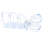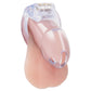 This firm, crystal-clear interlocking Cage fully restrains their shaft and tip, leaving only a pee-friendly opening and some tiny side vents free. You'll lock it up tight to one of four included rings looped behind their balls before letting them say bye-bye (if you feel generous) to the cock you now own.