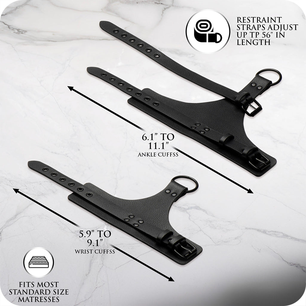 *Restraint straps: adjust up to 56"/142cm, Ankle cuffs: adjust 6.1–11.1"/15.5–28.2cm, Wrist cuffs: adjust 5.9–9.1"/15–23.1cm