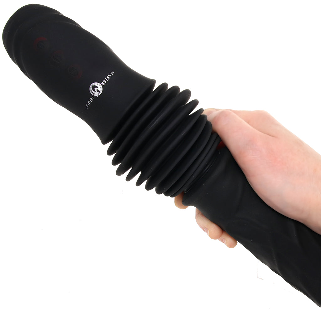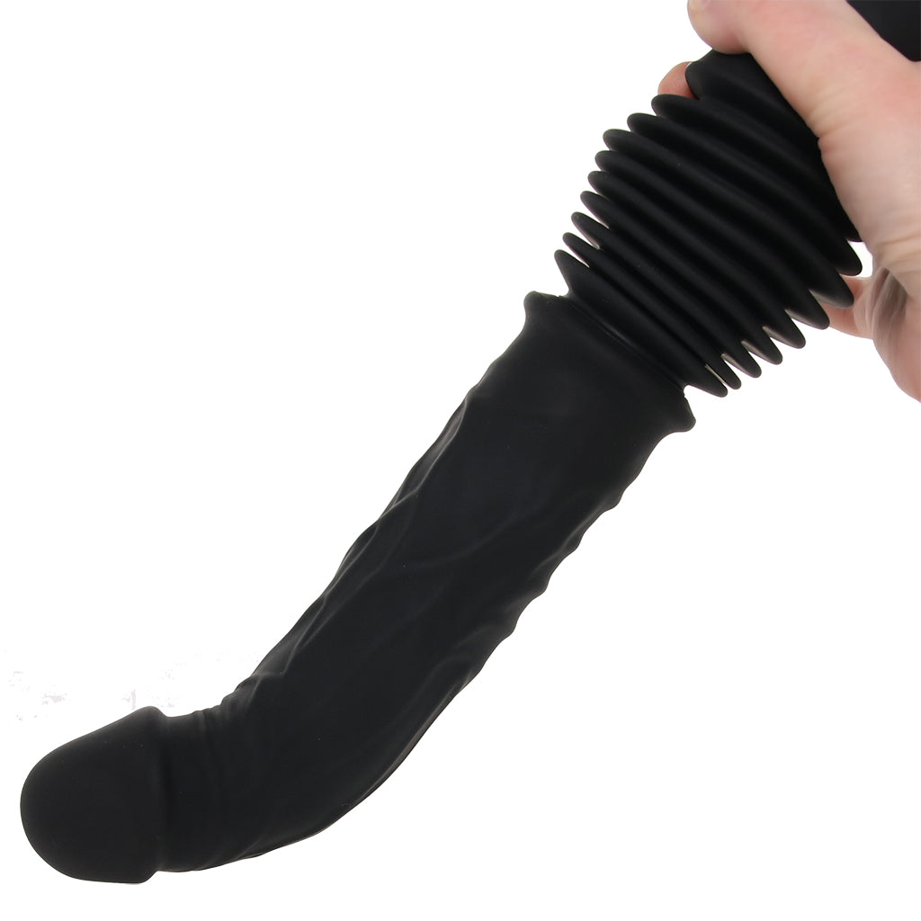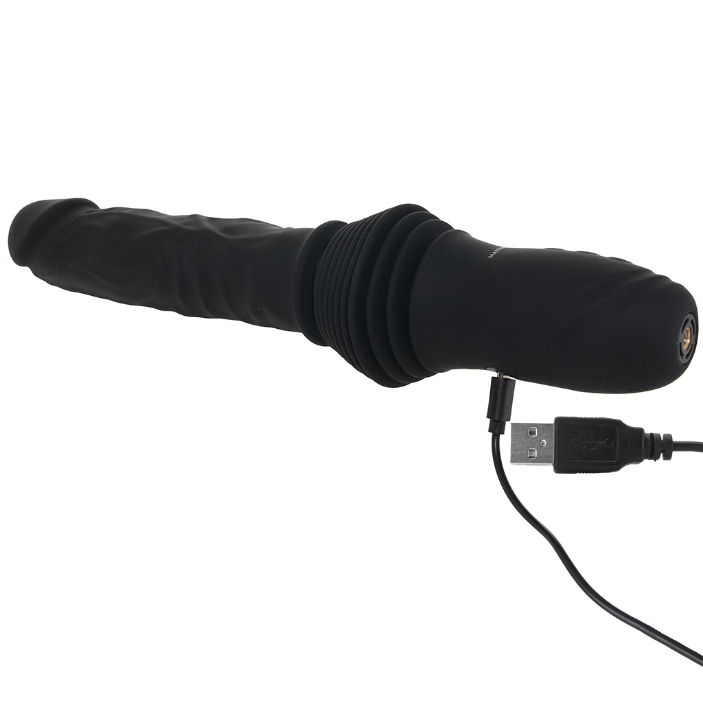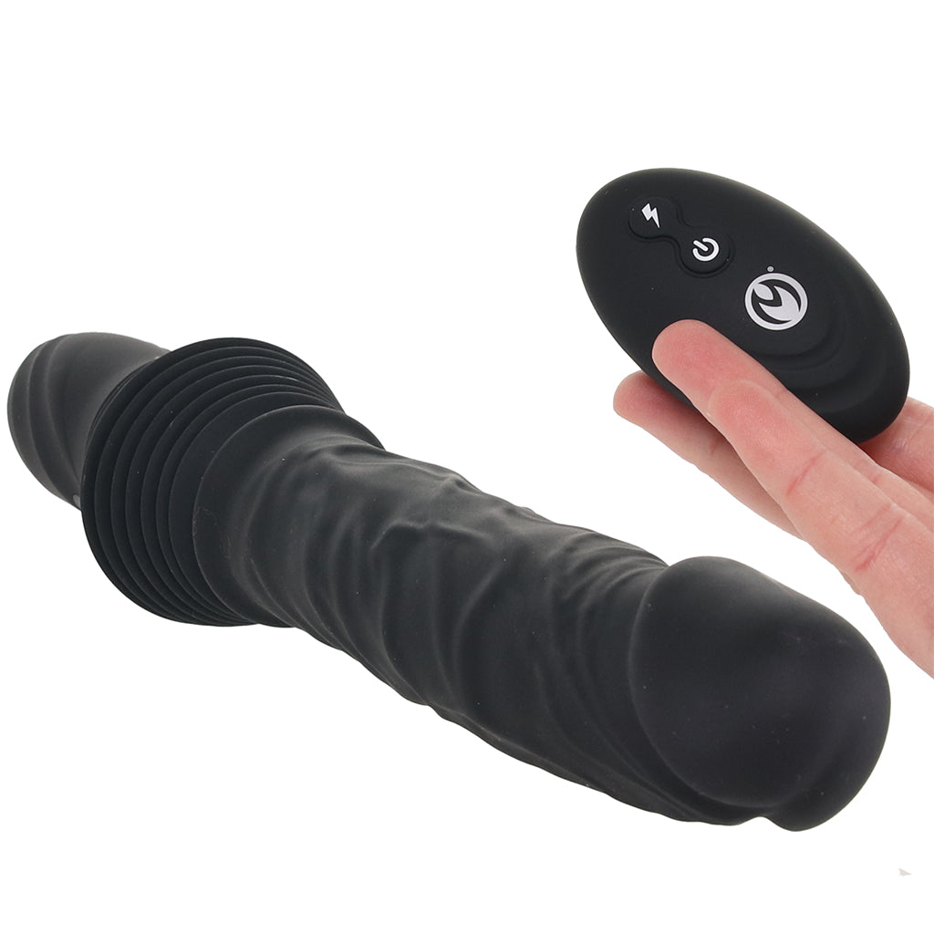 This realistic thrusting (deep!) penetrator pairs a squishy silicone textured shaft with built-in vibration and automatic in-and-out motion, so you’ve got steady movement working with a full, rumbly buzz. The big penis shape gives you something, shall we say, substantial to work with, while the extra up/down adds more motion as you go.