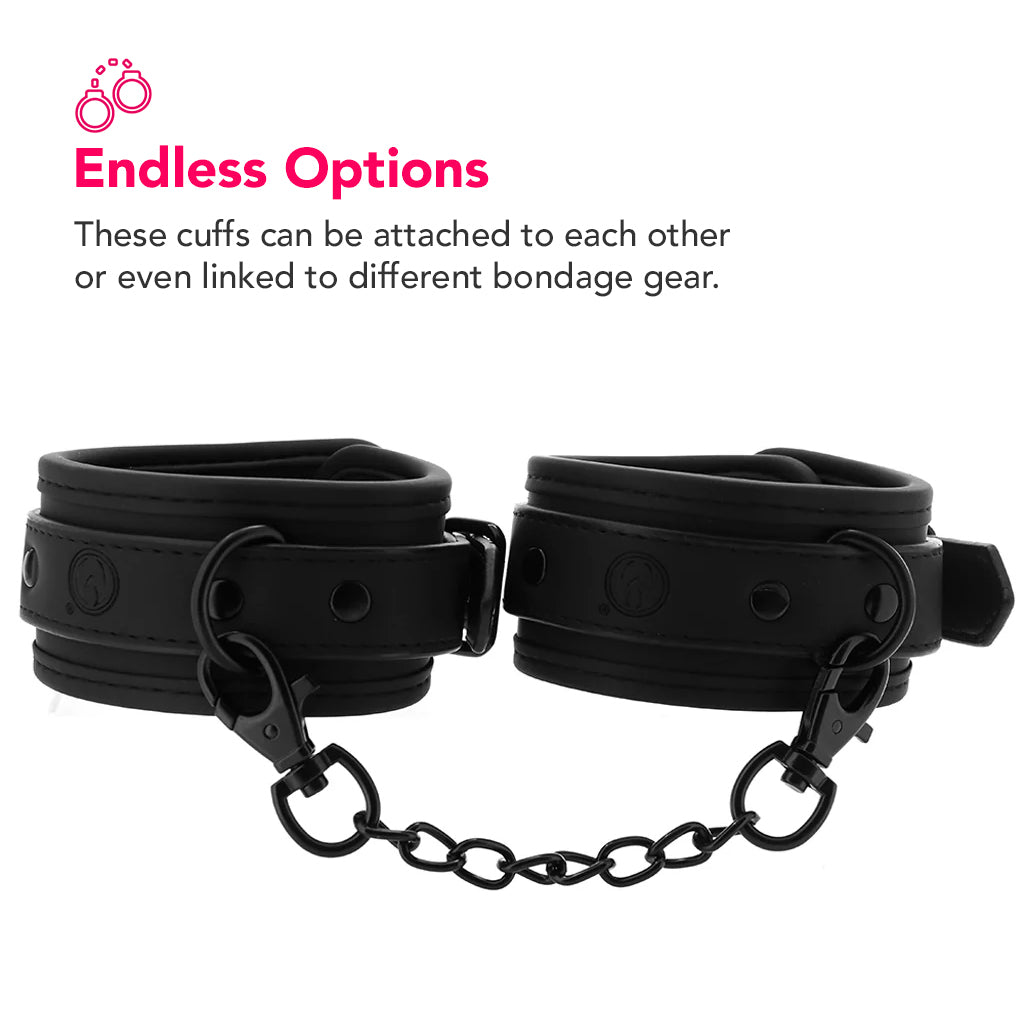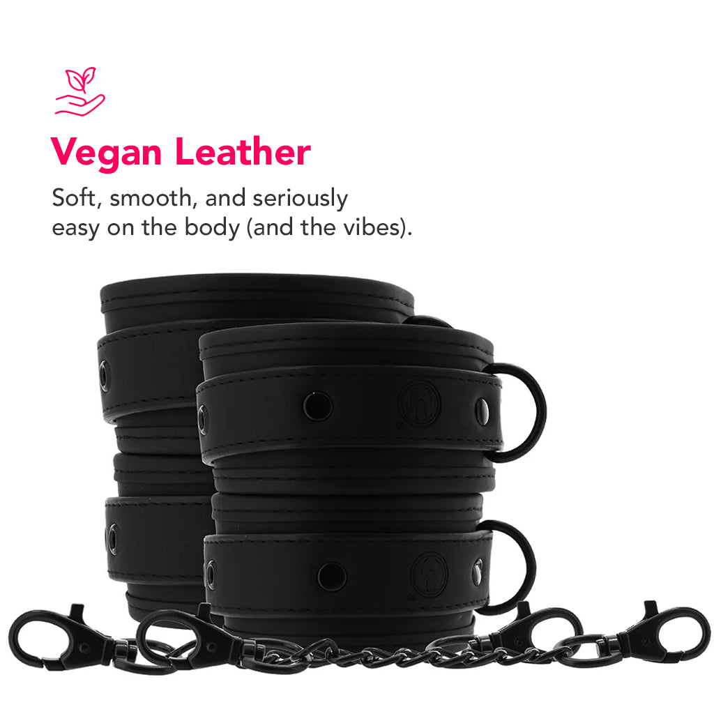 Once your or your partners wrists or ankles, or wrists and ankles are all wrapped up in wide bands of padded vegan leather, you'll be able to attach one cuff to the other courtesy of those chains, or use the chains as tethers to other other bondage gear. Each cuff features a D-ring and each chain has a swivel clasp at each end, so your playtime options are practically endless.