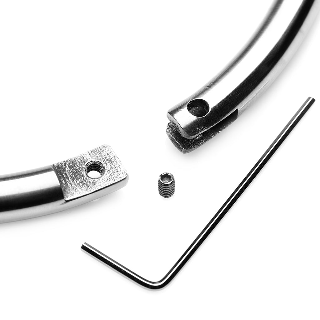 Here's how it works: the Collar features two curves pieces, each held together by a tiny screw. You can remove one or both to install it on a partner of choice before re-fastening the screw into place. The Collar comes with one allen key (plus a velvety black storage bag), that you'll need to lock and unlock the wearer. Keep it in a safe place, because the Collar's design is notoriously hard to escape from without that key!