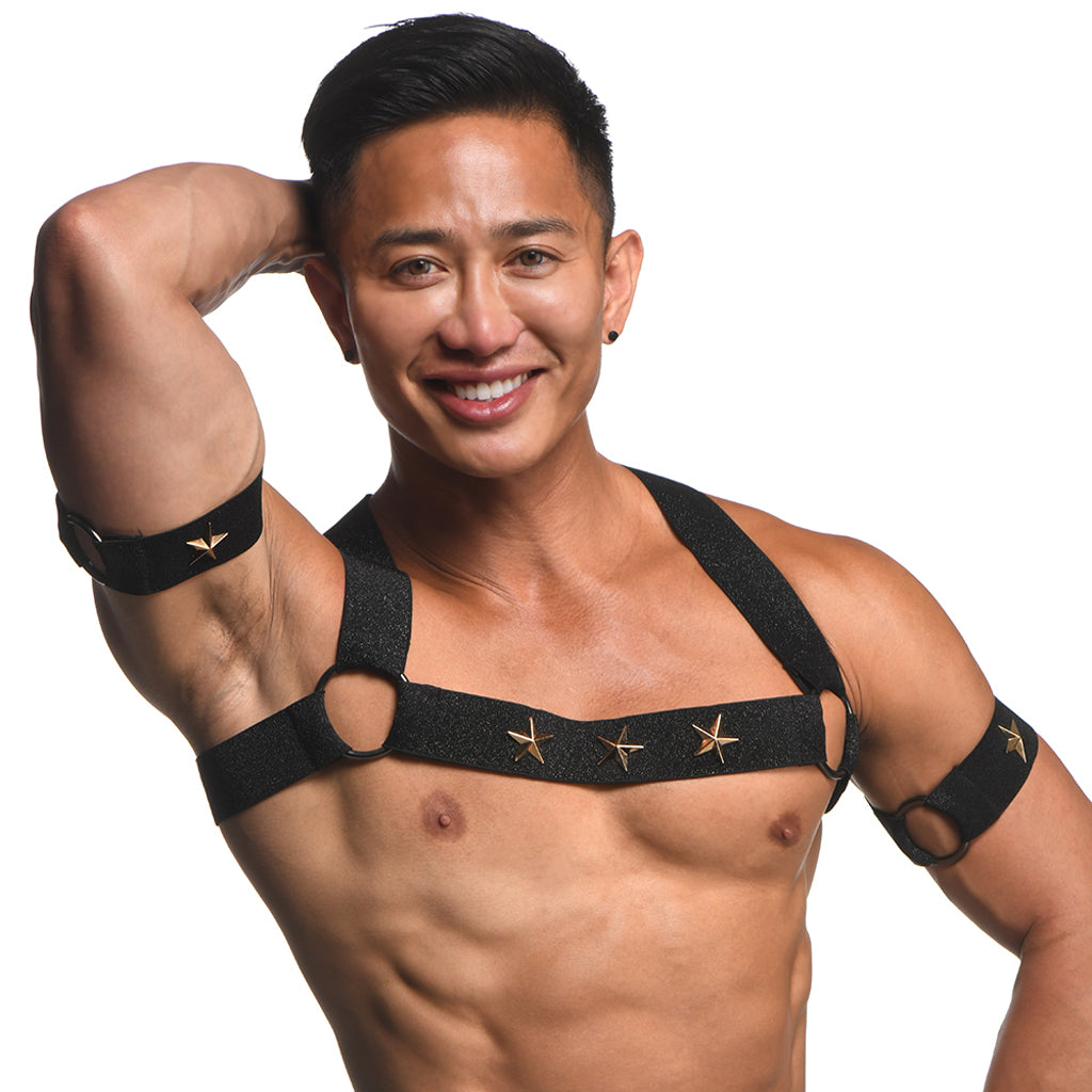 Slip it on to position the stretchy black straps and some gold metal star studs just right - they'll draw lots of attention to your chest and shoulders. Want to accent your biceps, too? There's a pair of matching star-studded arm bands for that!
