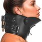 This extra thick collar wraps their neck in sexy black vegan leather with lots of comfy padding; a contoured chin brace supports your/their neck and head in the upright position. Double buckles around the back adjust for a perfect fit—they're lockable, too!