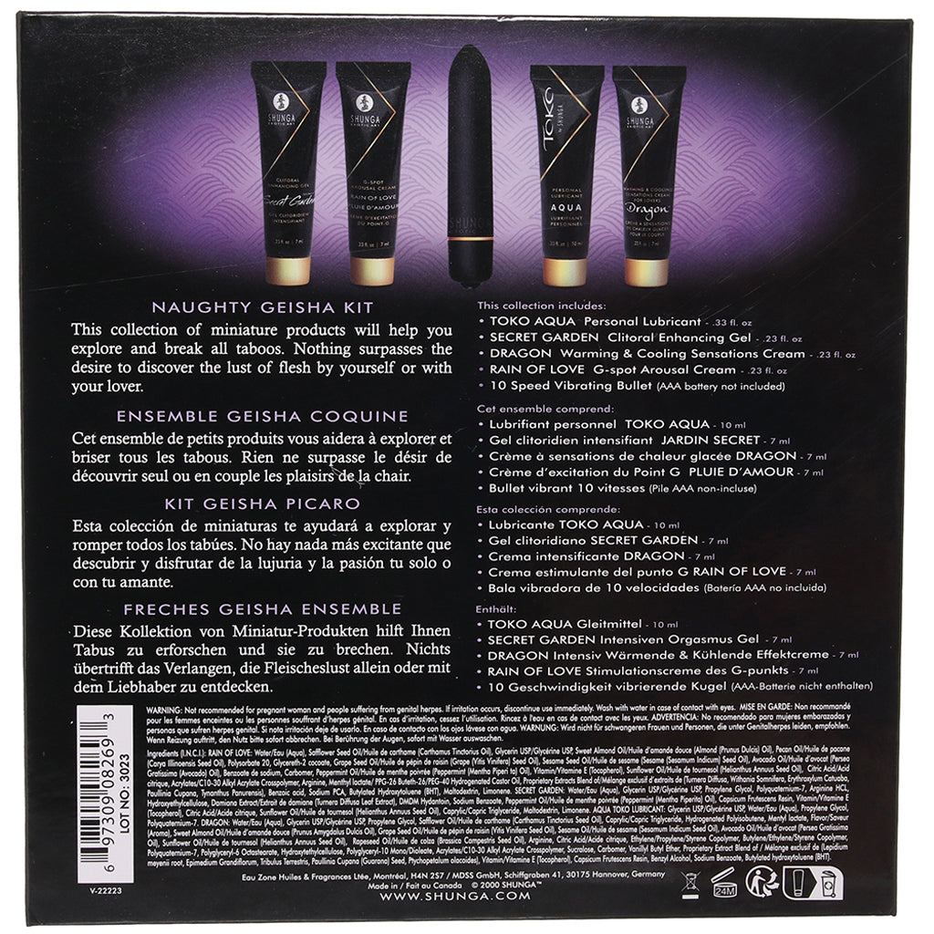 A luxurious (and mischievous) gift-ready collection of favorites as perfect for erotic getaways as for the bedside table, the Naughty Geisha Kit contains four miniature versions of Shunga's most adored pleasure products, plus a sexy little black bullet vibe.