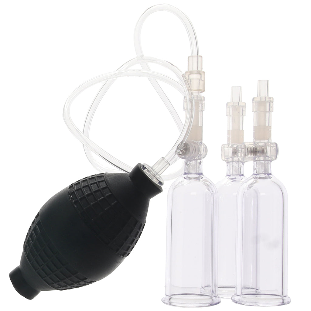 Once they're in place, two clear cylinder cups tug and tease your nipples. Meanwhile, the longer clit/outer sucker below works down below; you could even share it! Squeeze the bulb to activate inner pressure and enjoy!
