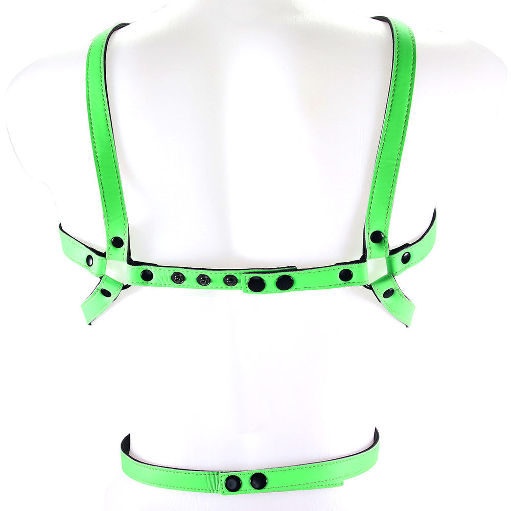 In vegan leather (PU) and metal, the Glow In The Dark Body Harness should be spot cleaned as needed. Fits Small to Medium sizes.