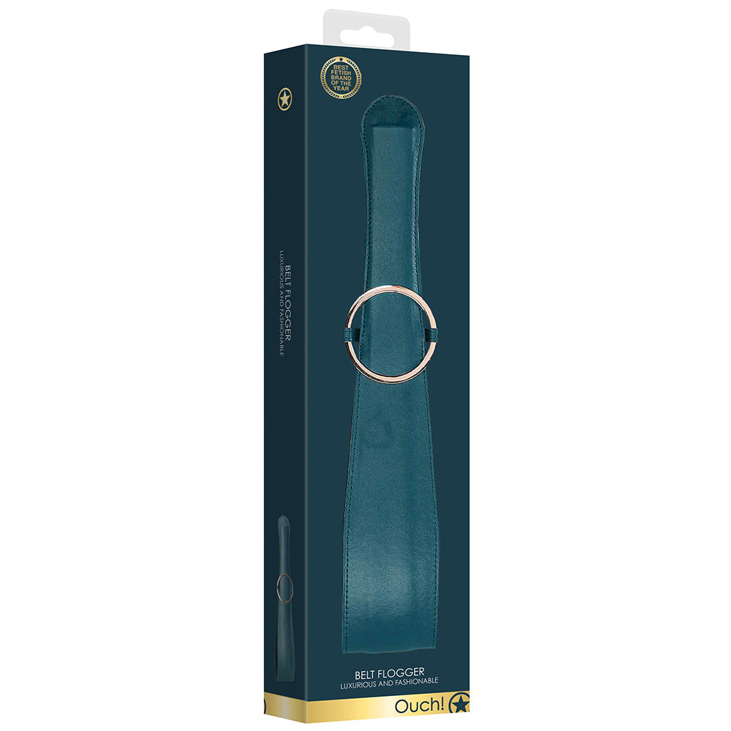 In gorgeous green faux leather and gold tone metal, the Ouch! Belt Flogger should be spot-cleaned as needed.