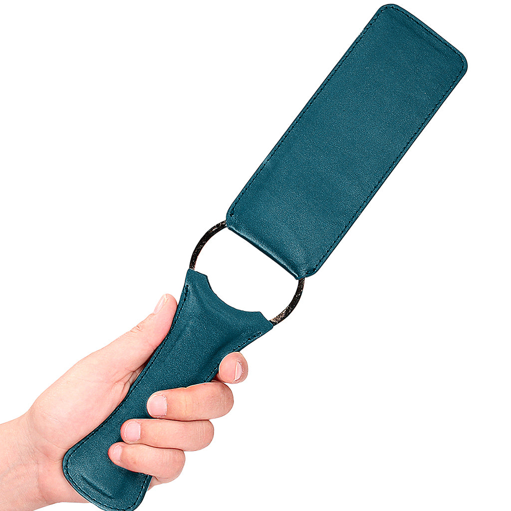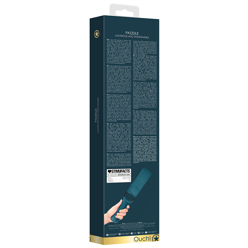 In gorgeous green faux leather and gold tone metal, the Ouch! Halo Paddle should be spot-cleaned as needed.