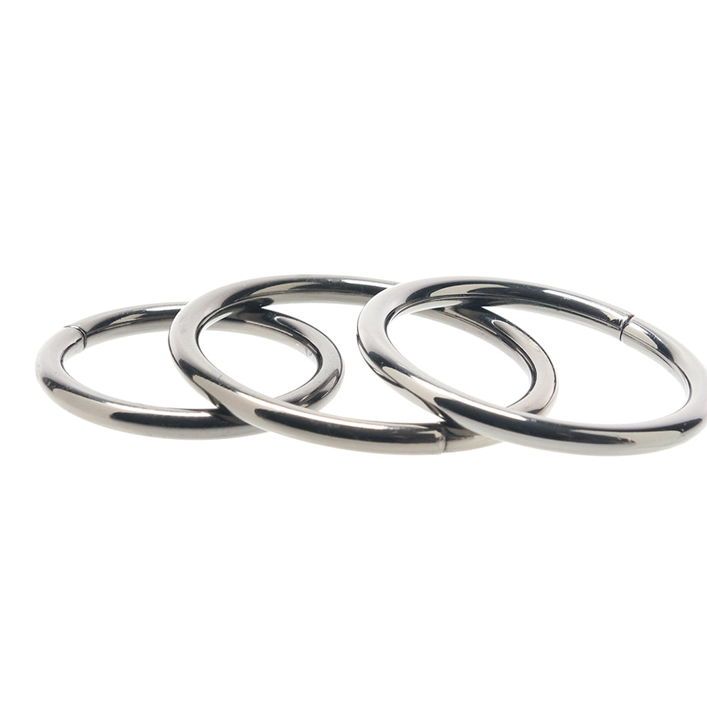 Three included metal O-rings (2"/5cm, 1.8"/4.5cm and 1.6"/4cm) hold tight to any compatible dildo, vibe or other penetrator. The rings snap on and off of the harness easily for quick change-ups.