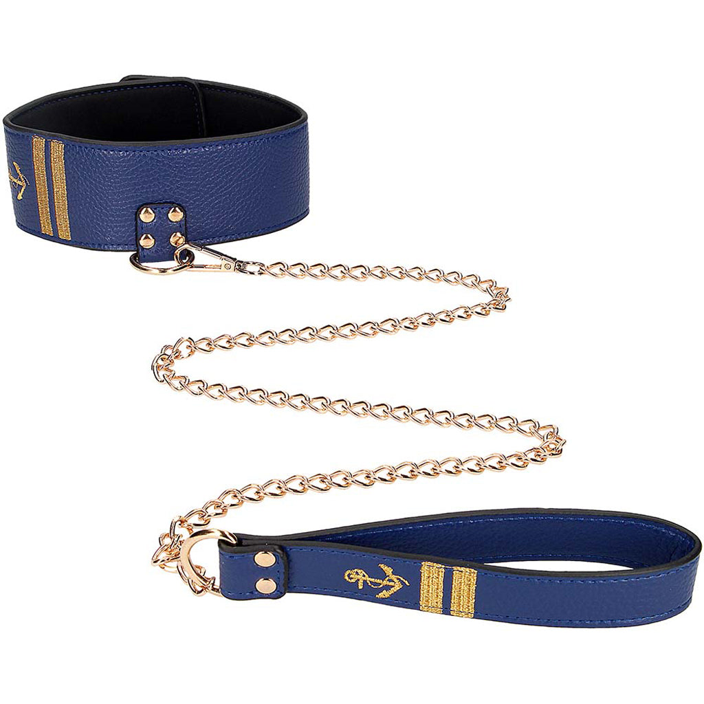 Comfortably wide and featuring some super sexy navy and gold sailor-style detailing, the Collar secures around your or their neck with a sturdy metal buckle. Completely detachable, the nice long (37.9"100cm) chain Leash clips securely to a big D ring set front and center of the Collar. Use together or with other compatible bondage gear - each piece can be independently enjoyed.