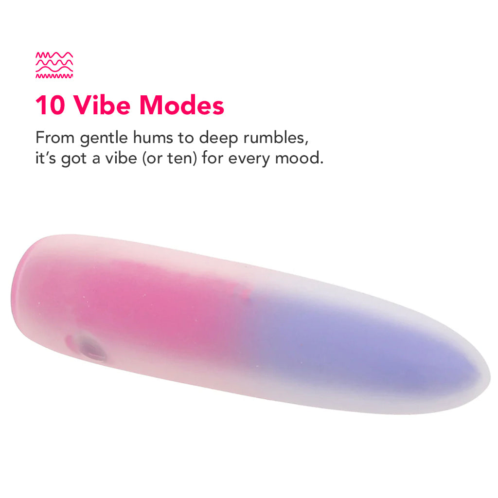 There are all sorts of ways for you and a partner (if one's around) to play with this pretty pink and blue treat—pinpoint clits, nipples, outer butts, penises, etc. Hold down the single power/function button to unlock vibration and cycle through your options.