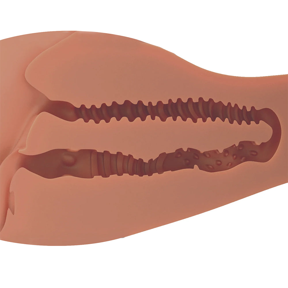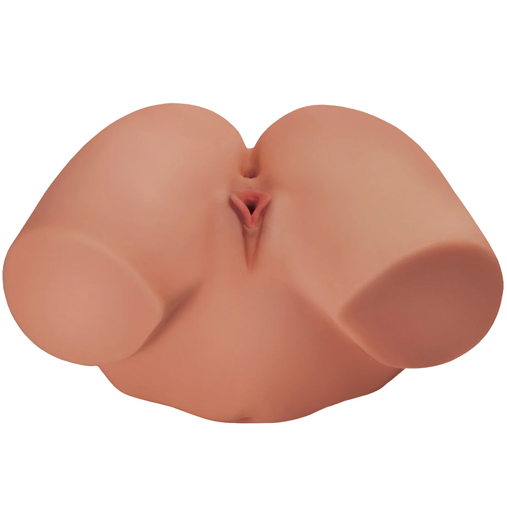Between squeezable cheeks and rounded hips, you'll find a tight, soft-lipped pussy and snug, puckered butt. Both feature separate, massively stimulating textures inside (they join up eventually), so feel free to Bang(er) both. A closed-off design naturally creates suction as you thrust, plus, it contains the aftermath. No muss, no fuss.