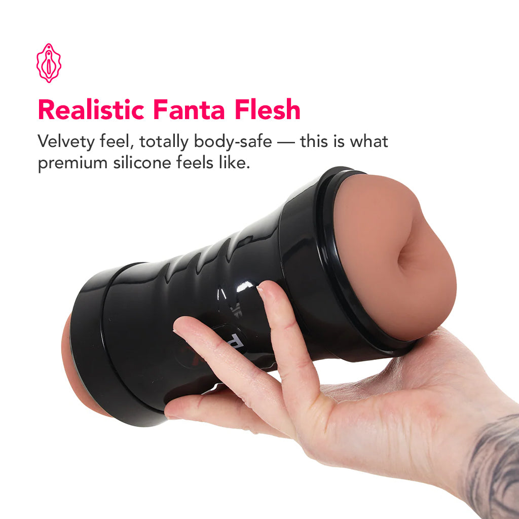 Pop the top of the discreet black case for access to a VERY detailed pussy, flip it over, and pop the other side for a snug little butt. In between, you'll feel a tight, clingy inner sleeve with tons of texture to suck you deeeeeep.