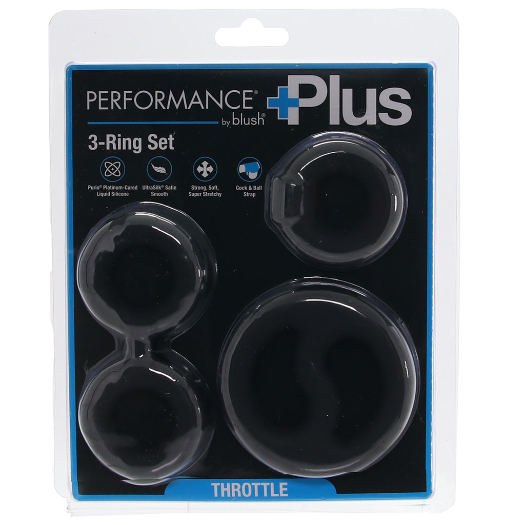 Rev it up and keep it running! The Performance Plus Throttle Set is built for anyone who likes to start strong and stay in high gear. This 3-piece powerhouse includes two snug Rings and one cock & ball Stretcher, giving you versatile ways to boost stamina, maintain firmer erections, and keep the ride going longer.