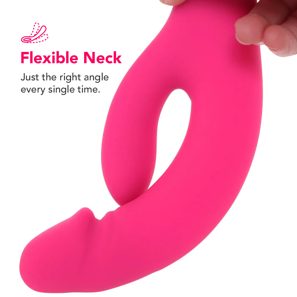 Smooth at the tip with just a hint of detail, Slim slides in easy and bends with you to find your G and inner sweet spots. Meanwhile, that wide, tongue-shaped stimulator stays busy outside, throbbing against your clit and any other outer O-zones in reach.
