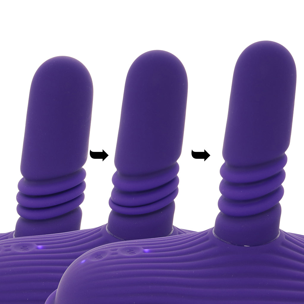 The flat-based Thrust & Grind stays put on beds, floors, chairs, and more, so you can settle in and focus on the good stuff. There’s texture in front of and behind the thrusting penetrator for extra grind-time payoff, plus 12 vibration modes to explore on their own or pair with three thrusting speeds for more movement.