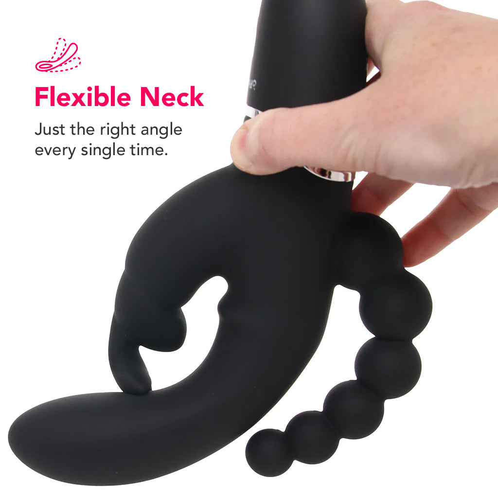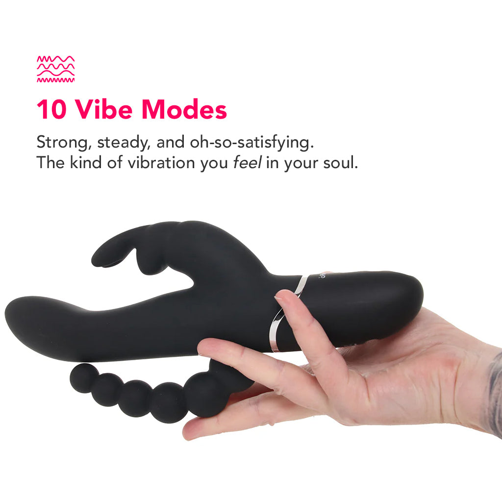 Made of body-safe silicone, the Triple Rabbit is waterproof, USB-C rechargeable, and ready to go again and again. Pair with water-based lube for the slickest ride, and clean with warm soapy water or toy cleaner when the party’s over.