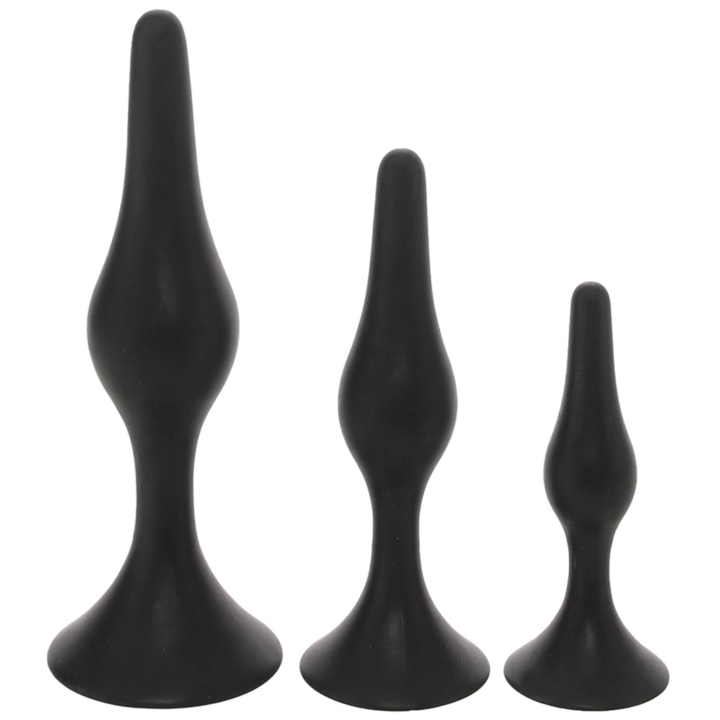 Inside, you'll find three curvily tapered plugs in black silicone. They're each shaped for easy insertion, quick adjustments and removal, but the similarities stop there. Size-wise, they're very different, all the better to help you work up to or dive right into butt play bliss.
