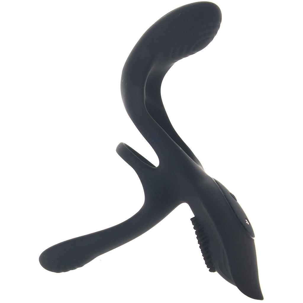 A super sexy and fearlessly full-coverage couple's tool in supple silicone, Playboy's The 3 Way Vibrating Cock Ring combines a classic cock and ball ring with a curvy butt teaser, super powered vibration, AND a textured shaft extension positioned. Hold on tight!