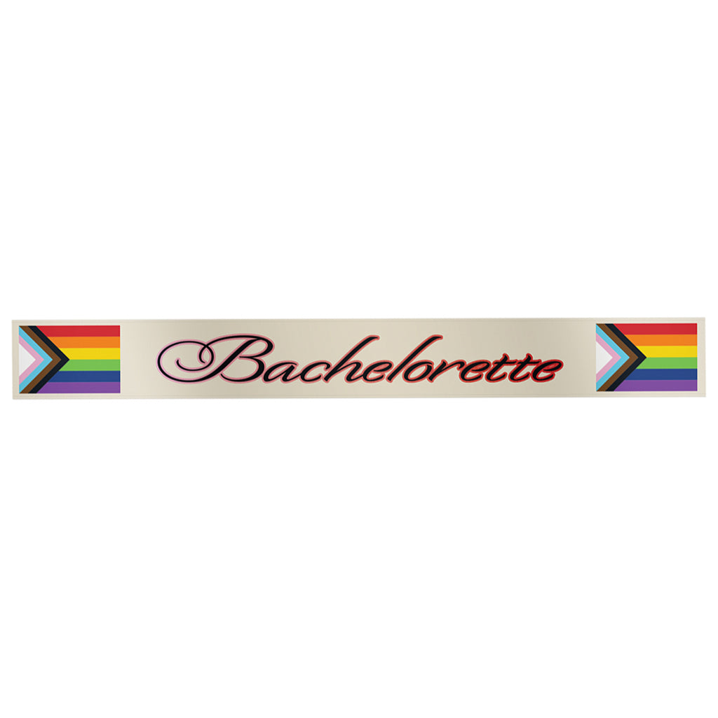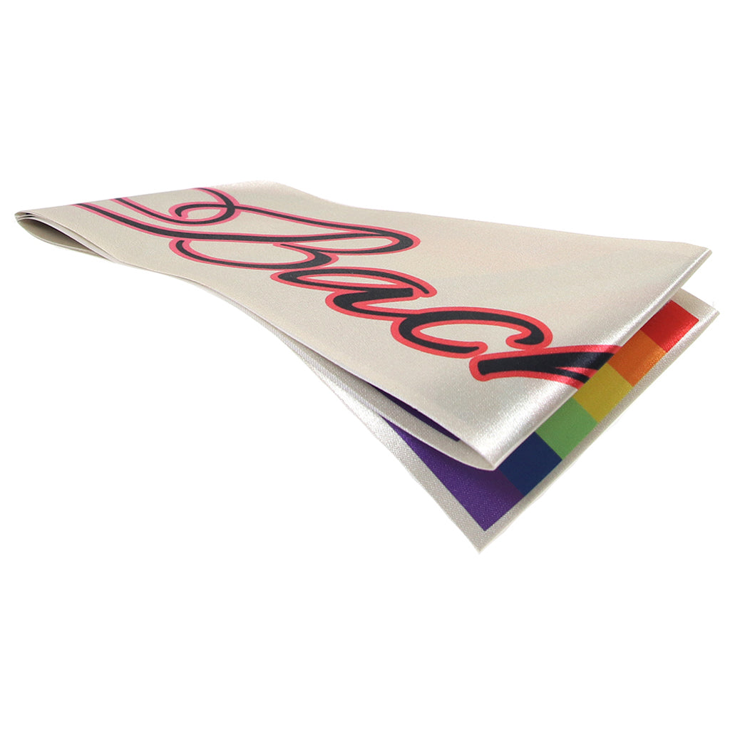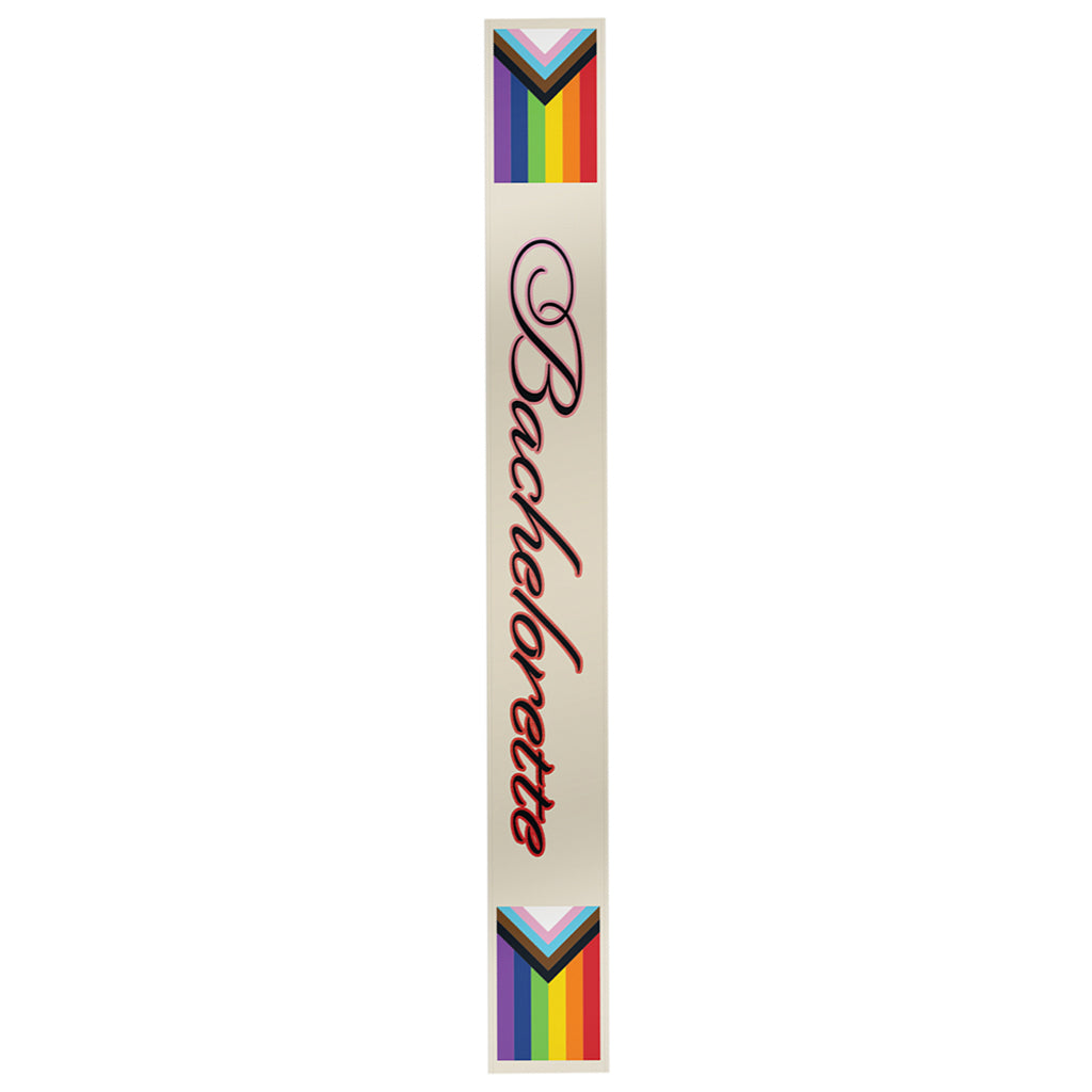 Whether you wear it over your chest or hang it on the wall, this colorful sash from Kheper Games proudly proclaims your love of progress! This silky and inclusive LGBTQIA+ piece is about 30"/76.2cm long folded and 3.5"/9cm wide