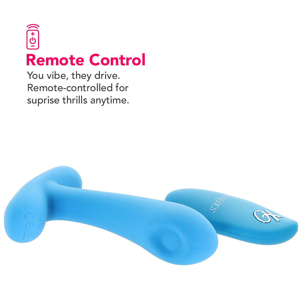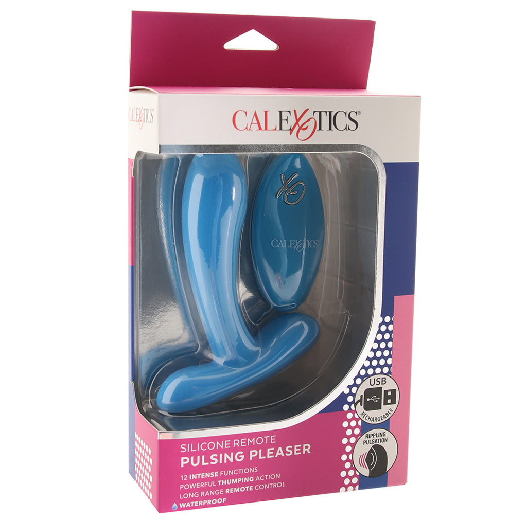 At the tip of your turquoise Pleaser, you'll see and feel a firm, up-reaching curve. At the touch of a button, an embedded bead pulse in and out, tirelessly stimulating your or your partner's inner erogenous zones. There are twelve tap speeds to choose from, all activated and varied with a single button at the base, or using an included remote.