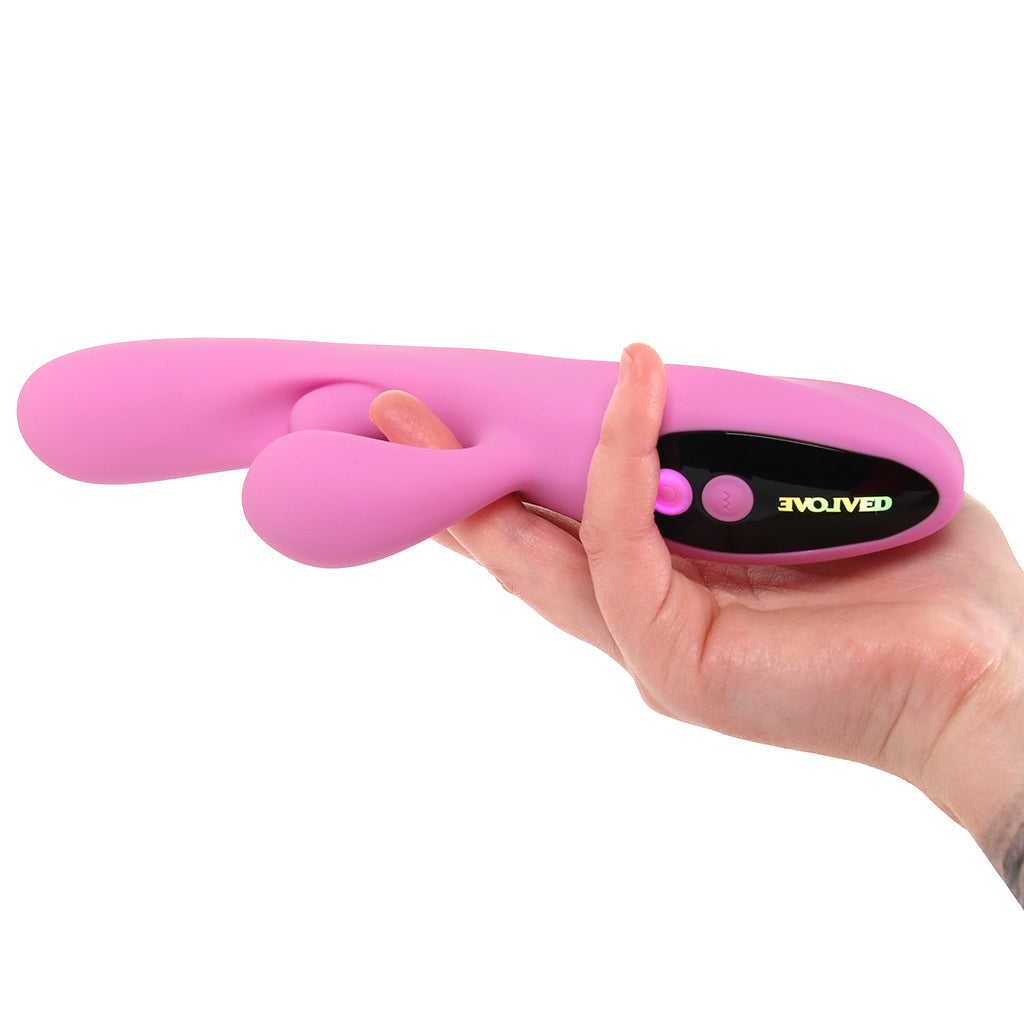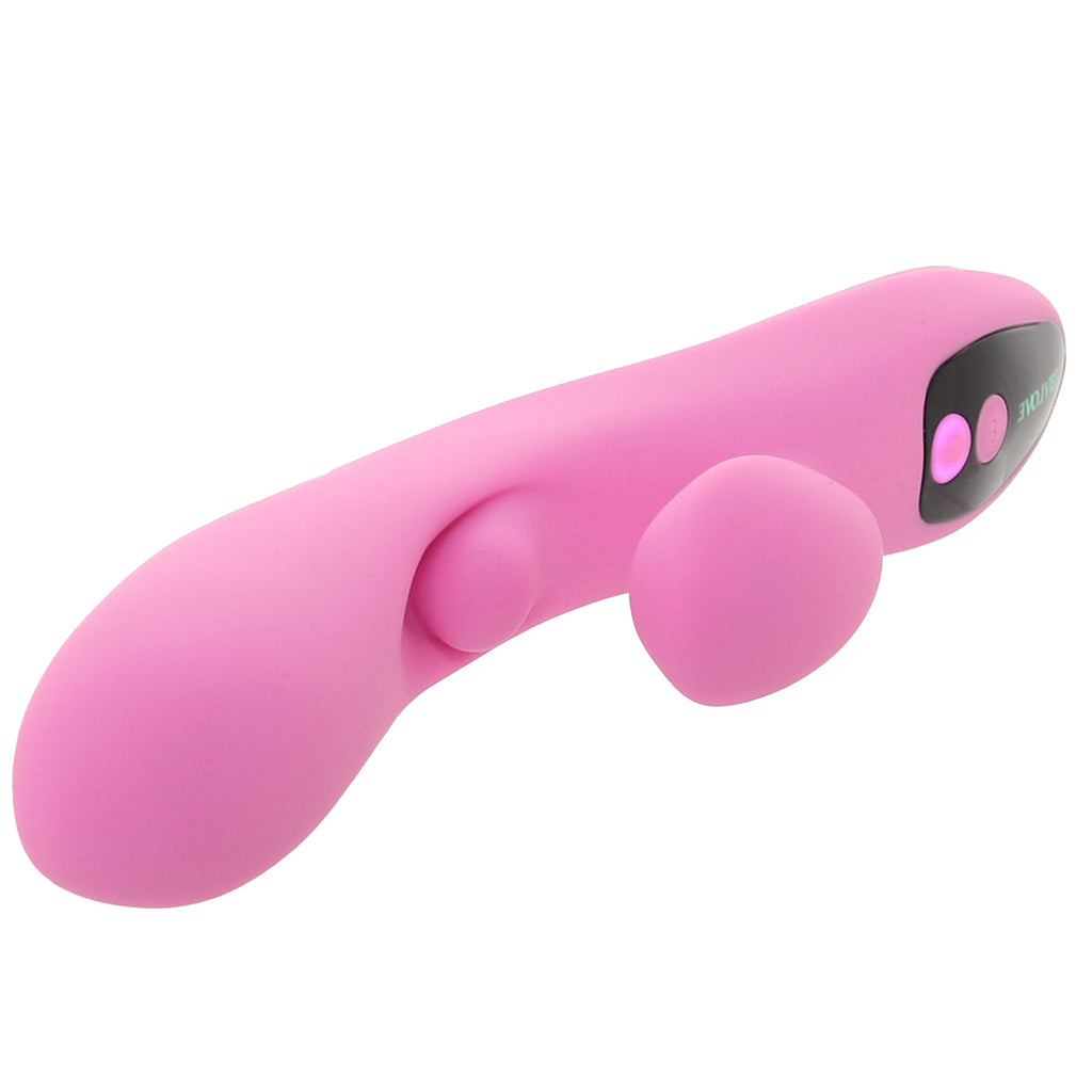 This thrusting, vibrating vibe brings some serious show-off energy right from the start. The curved shaft buzzes with deep vibration while the chunky external stimulator brings its own power to the party. Then the little internal bud pushes outward in ten speeds and patterns for a totally new kind of internal sensation. Call it a pleasure breakthrough!