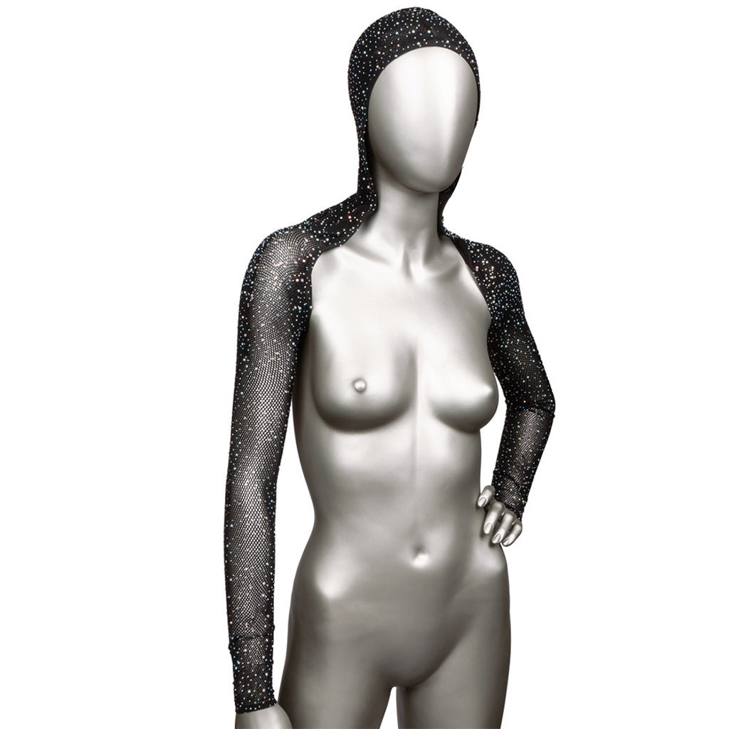 Soft and stretchy, this sparkly, rhinestone and mesh beauty features long sleeves, a mysterious hood, and a tiny back panel ideal for backless dresses and various lingerie accoutrements.